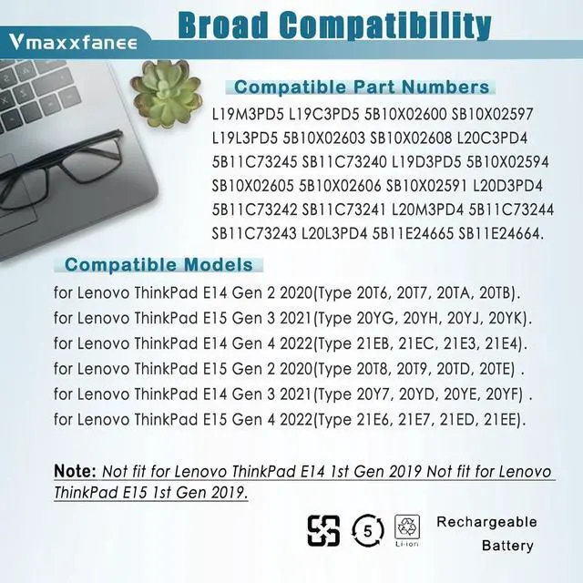 Compatible laptop ModelsReplacement for Lenovo ThinkPad E14 Gen 2 2020(Type 20T6, 20T7, 20TA, 20TB); Lenovo ThinkPad E15 Gen 3 2021(Type 20YG, 20YH, 20YJ, 20YK); Lenovo ThinkPad E14 Gen 4 2022(Type 21EB, 21EC, 21E3, 21E4); Lenovo ThinkPad E15 Gen 2 2020(Type 20T8, 20T9, 20TD, 20TE) ; Lenovo ThinkPad E14 Gen 3 2021(Type 20Y7, 20YD, 20YE, 20YF) ;Lenovo ThinkPad E15 Gen 4 2022(Type 21E6, 21E7, 21ED, 21EE). (Not fit for Lenovo ThinkPad E14 1st Gen 2019 /Not fit for Lenovo ThinkPad E15 1st Gen 2019)