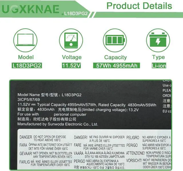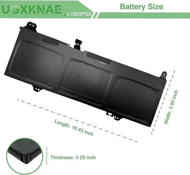 Specifications: Model Name: L18D3PG2 standard Rechargeable Li-ion Battery; Battery Type: Lithium_ion; Voltage: 11.52 V; Capacity: 57 Wh 4955 mAh.Cells: 3 cells; Color: Black. Packages includes:1x L18D3PG2 Laptop Battery, 2 x Screwdrivers for easy installation,1x Instruction
