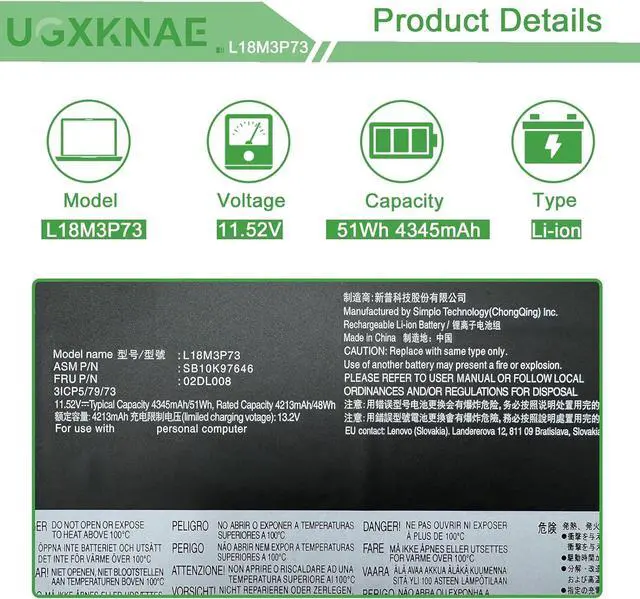 Specifications: Model Name: L18M3P73 standard Rechargeable Li-ion Battery; Battery Type: Lithium_ion; Voltage: 11.52 V; Capacity: 51 Wh 4345 mAh.Cells: 3 cells; Color: Black. Packages includes:1x L18M3P73 Laptop Battery, 2 x Screwdrivers for easy installation,1x Instruction