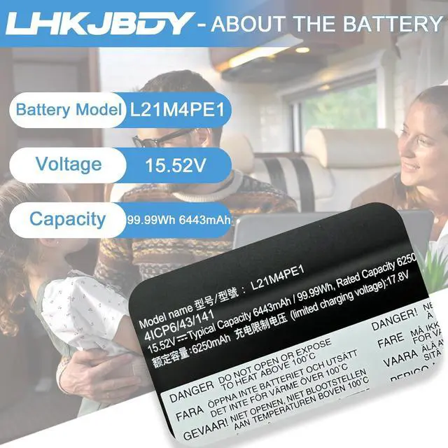 Specifications: Type: L21M4PE1; Voltage: 15.52V; Capacity: 6443mAh/99.99Wh; Color: Black. Battery type: Lithium-Ion; The Packages includes: 1pcs L21M4PE1 Laptop Battery Replacement, 2pcs Screwdrivers, 1 pcs Instruction for L21M4PE1 Battery. The batteries are certified by UL and CE, ensuring safety and high performance