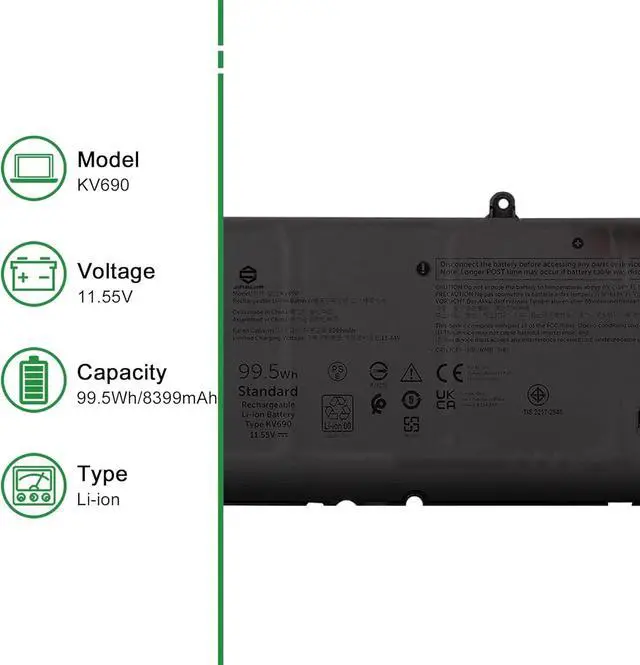 Model: KV690 // Voltage: 11.55V // Capacity: 99.5Wh 8399mAh // Color: Black // Type: Plug & Play Li-ion Battery.