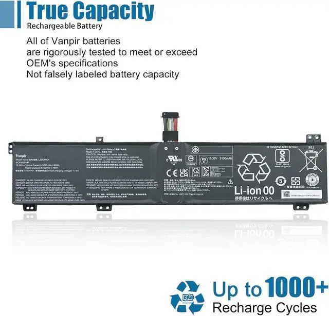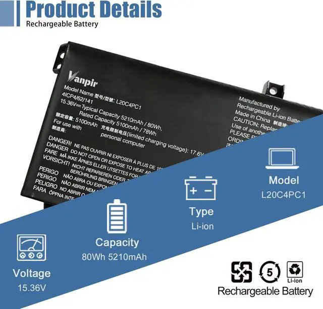 SpecificationsModel: L20C4PC1. Type: Li-ion. Voltage: 15.36V. Capacity:80Wh 5210mAh. Up to 1000 recharge cycles over the life of the battery.