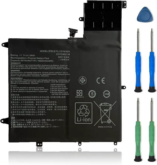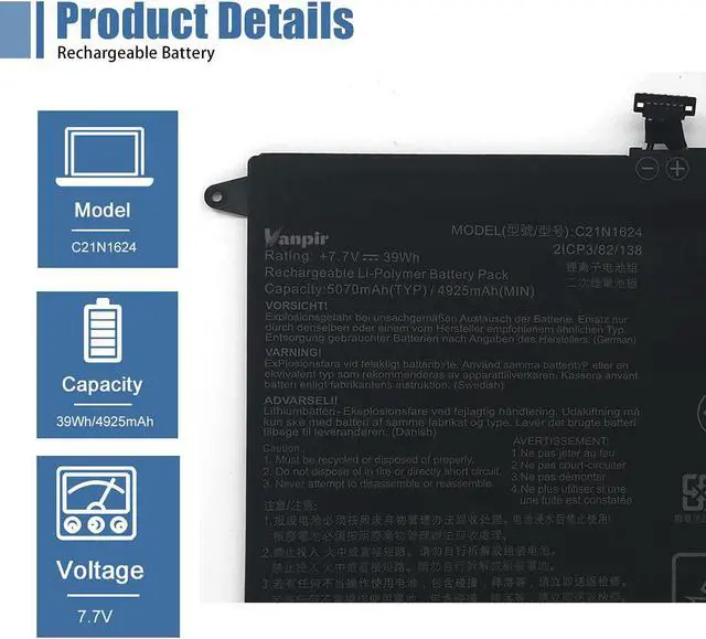 SpecificationsModel: C21N1624. Type: Li-ion. Voltage: 7.7V. Capacity: 39Wh 5070mAh. Up to 1000 recharge cycles over the life of the battery.