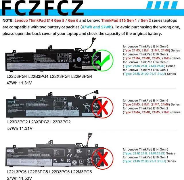Compatible with Machine Models for Lenovo ThinkPad E14 Gen 5 (Type: 21JK 21JL 21JR 21JS) Series; for Lenovo ThinkPad E16 Gen 1 (Type: 21JN 21JQ 21JT 21JU) Series; for Lenovo ThinkPad E14 Gen 6 (Type: 21M3 21M4 21M7 21M8) Series; for Lenovo ThinkPad E16 Gen 2 (Type: 21MA 21MB 21M5 21M6) Series. (NOTE: These laptop series are all compatible with two battery capacities (47Wh and 57Wh). To avoid purchasing the wrong one, please open the back cover of your laptop and check the capacity of the original battery.)