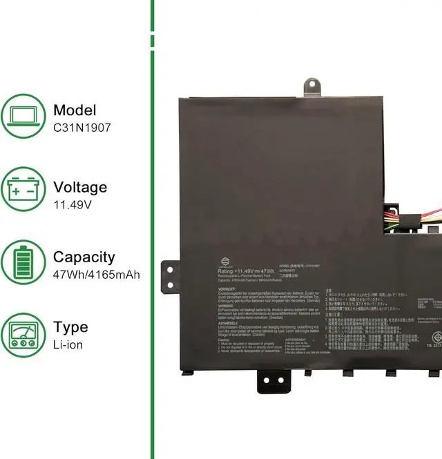 Model: C31N1907 // Voltage: 11.49V // Capacity: 47Wh 4165mAh // Color: Black // Type: Plug & Play Li-ion Battery.