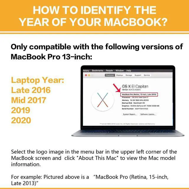 THE WRONG MODEL WILL NOT BE USED & HOW TO IDENTIFY THE YEAR OF YOUR LAPTOP-- There are three series, namely MacBook, MacBook Air, and MacBook Pro, which come in different sizes. Please first clarify which series and size your laptop belongs to. Select the logo image in the menu bar in the upper left corner of the MacBook screen and click "About This Mac" to view the Mac model information. Only compatible with MacBook Pro 13-inch: Late 2016, Mid 2017, 2019, 2020, 2022. Fits Models A1708 A1713 A2159 A2171 A2289 A2338