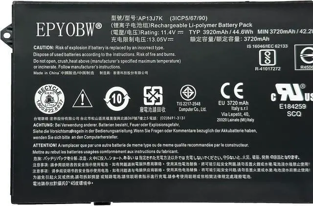 Specifications Battery Model: AP13J7K Long Cable / Voltage: 11.4V / Capacity: 44.6Wh 3920mAh 3-Cell / Color: Black / Condition: Brand New.