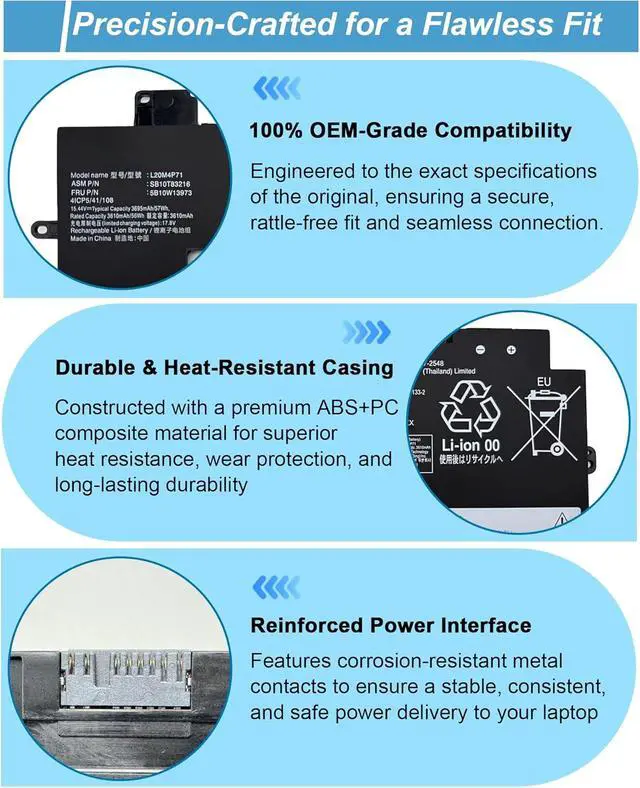 Specifications: Model Name: L20M4P71 standard Rechargeable Li-ion Battery; Battery Type: Lithium_ion; Voltage: 15.44 V; Capacity: 57Wh 3695mAh . Color: Black. Packages includes:1x L20M4P71 Laptop Battery, 2 x Screwdrivers for easy installation, 1x Instruction