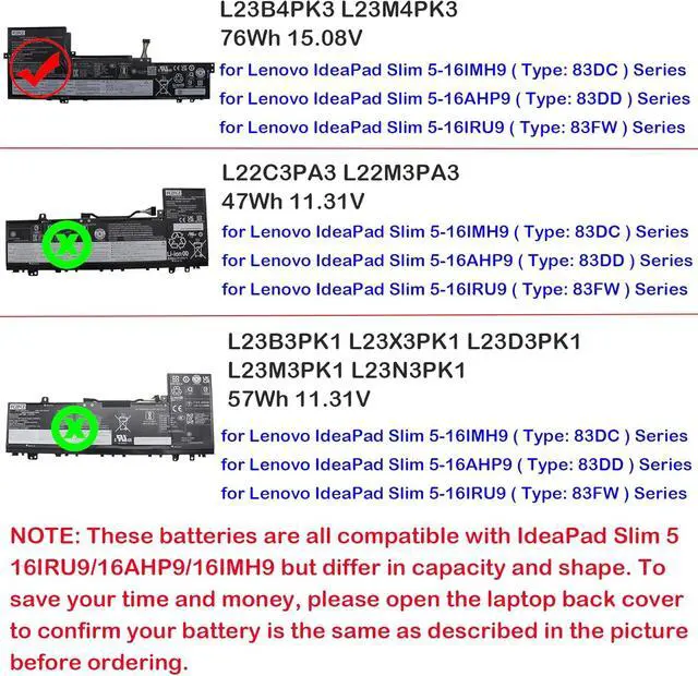 Compatible with Machine Modelsfor Lenovo IdeaPad Slim 5-16IRU9 (Type: 83FW) series; for Lenovo IdeaPad Slim 5-16AHP9 (Type: 83DD) series ; for Lenovo IdeaPad Slim 5-16IMH9 (Type: 83DC) series. NOTE: This battery is only compatible with the IdeaPad Slim and is not compatible with the IdeaPad Pro. These laptop models are compatible with batteries of different capacities (76Wh, 47Wh, 57Wh) and shapes. To save your time and money, please open the laptop back cover to confirm your battery is the same as described in the picture before ordering.