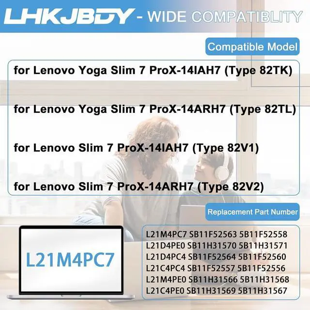 Compatible Laptop Models:L21M4PC7 battery fit for Lenovo Yoga Slim 7 ProX-14IAH7 (Type 82TK) Series; fit for Lenovo Yoga Slim 7 ProX-14ARH7 (Type 82TL) Series; fit for Lenovo Slim 7 ProX-14IAH7 (Type 82V1) Series; fit for Lenovo Slim 7 ProX-14ARH7 (Type 82V2) Series