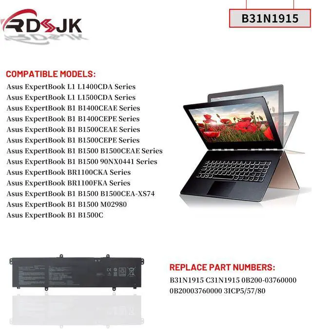 Compatible Models: For Asus ExpertBook L1 L1400CDA L1500CDA Series; For Asus ExpertBook B1 B1400CEAE B1400CEPE Series; For Asus ExpertBook B1 B1500CEAE B1500CEPE Series; For Asus ExpertBook B1 B1500 B1500CEAE Series; For Asus ExpertBook B1 B1500 90NX0441 Series; For Asus ExpertBook BR1100CKA BR1100FKA Series; For Asus ExpertBook B1 B1500 B1500CEA-XS74, For Asus ExpertBook B1 B1500 M02980, For Asus ExpertBook B1 B1500C
