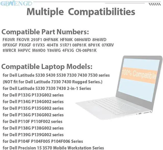 Compatible Model for Dell Latitude 5330 5430 5530 7330 7430 7530 series (NOT fit for Dell Latitude 7330 7430 Rugged Series.) for Dell Latitude 5330 7330 7430 2-in-1 Series for Dell P133G P133G002 series for Dell P134G P134G002 series for Dell P135G P135G002 series for Dell P136G P136G002 series for Dell P110F P110F002 series for Dell P138G P138G002 series for Dell P139G P139G002 series for Dell P104F P104F005 P104F006 Series for Dell Precision 15 3570 Mobile Workstation Series