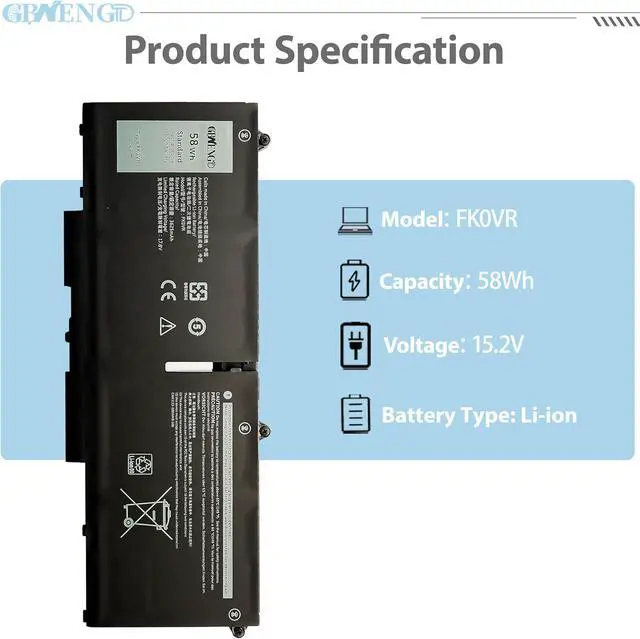 Specifications Model: FK0VR Capatity: 58Wh Voltage:15.2V Color: Black Battery type: Rechargeable Li-ion Battery Condition: 100% brand New from Manufacturer.