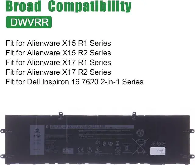 Model: DWVRR // Voltage: 11.4V // Capacity: 87Wh 7250mAh // Color: Black // Type: Plug & Play Li-ion Battery.
