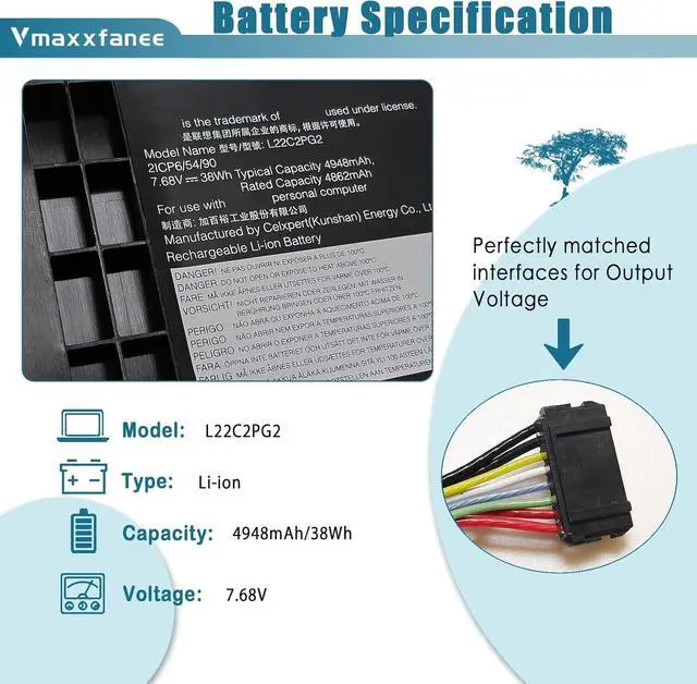Lenovo L22C2PG2 Specifications Model: L22C2PG2 . Voltage: 7.68V . Capacity : 4948mAh/38Wh Color: Black . Condition: 100% brand New.