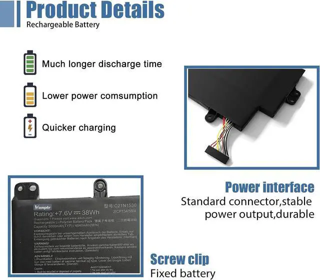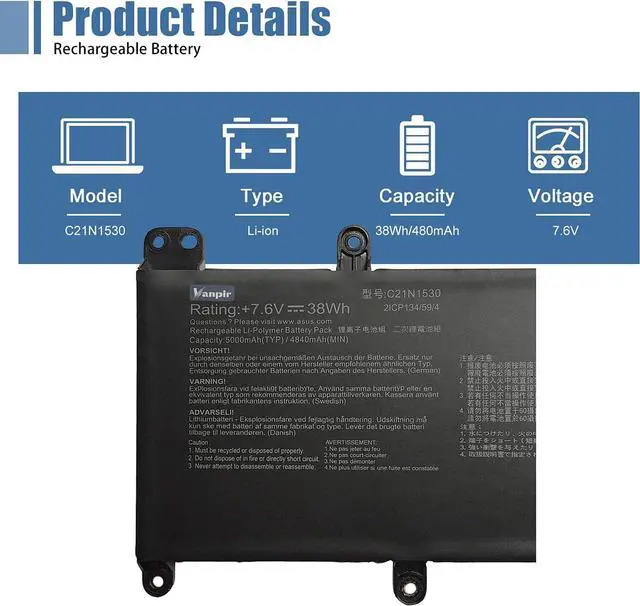 SpecificationsModel: C21N1530. Type: Li-ion. Voltage: 7.6V. Capacity: 38Wh 5000mAh. Up to 1000 recharge cycles over the life of the battery. Brand New Grade A cell battery, all Vanpir batteries are certified by UL / CE / FCC / RoHS for safety.