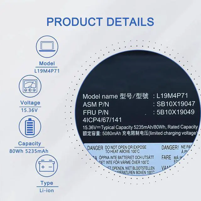 SpecificationsItem Model: L19M4P71 ; Product Type: Replacement battery; Battery Type: Li-ion; Voltage: 15.36V; Capacity: 80Wh 5235mAh; Battery Life: Up to 500 recharge cycles over the life of the battery.