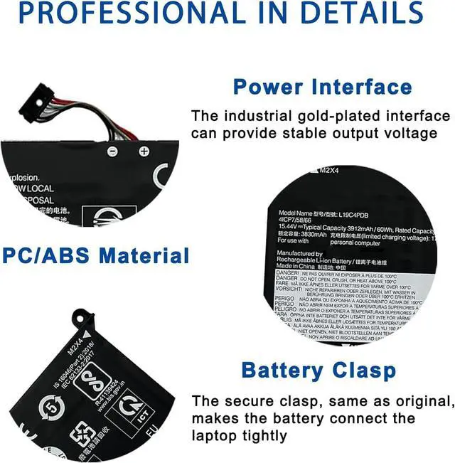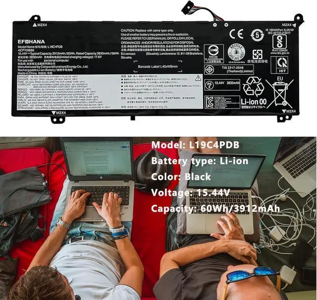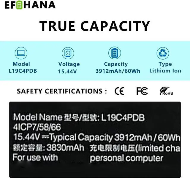 SpecificationsModel:L19C4PDB // Battery type: Li-ion // Voltage: 15.44V // Capacity:60Wh 3912mAh // 100% New from Manufacturer. Top circuit boards and smart chip.