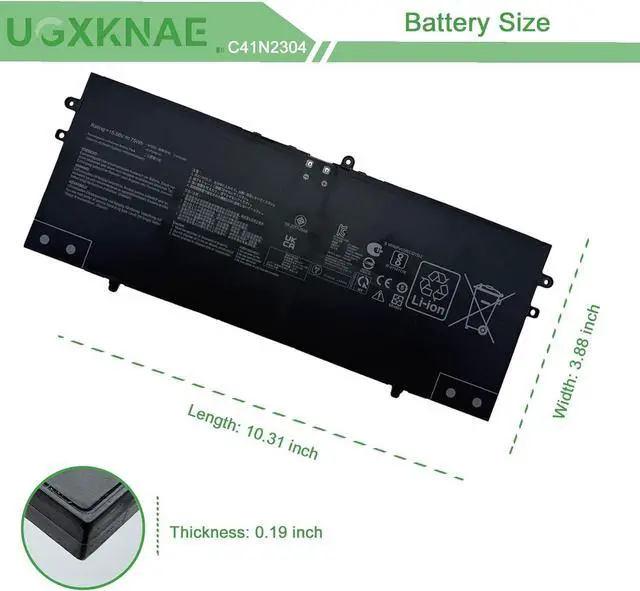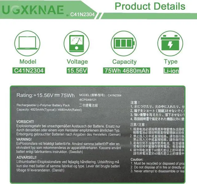 Specifications: Model Name: C41N2304 standard Rechargeable Li-ion Battery; Battery Type: Lithium_ion; Voltage: 15.56 V; Capacity: 75 Wh 4680 mAh. Color: Black. Packages includes:1x C41N2304 Laptop Battery, 2 x Screwdrivers for easy installation, 1x Instruction