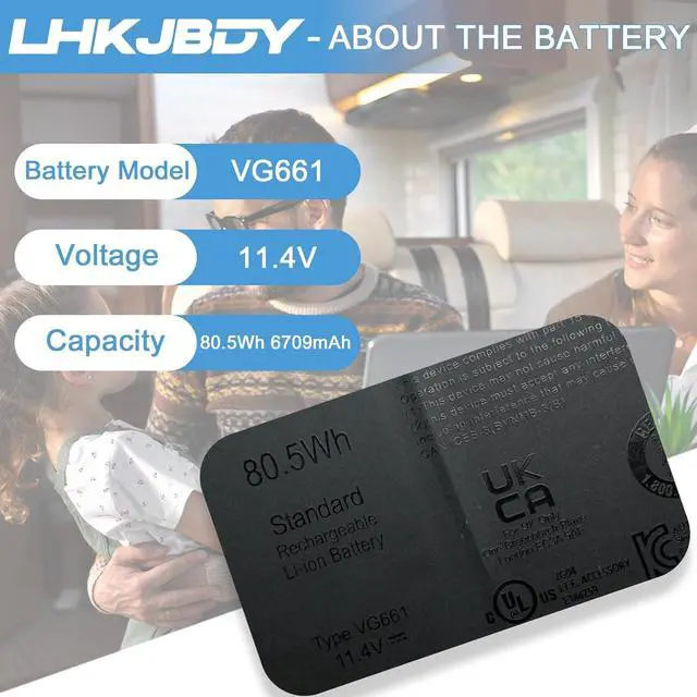 Specifications: Type: VG661; Voltage: 11.4V; Capacity: 6709mAh/80.5Wh; Color: Black. Battery type: Lithium-Ion; The Packages includes: 1pcs VG661 Laptop Battery Replacement, 2pcs Screwdrivers, 1 pcs Instruction for VG661 Battery. The batteries are certified by UL and CE, ensuring safety and high performance