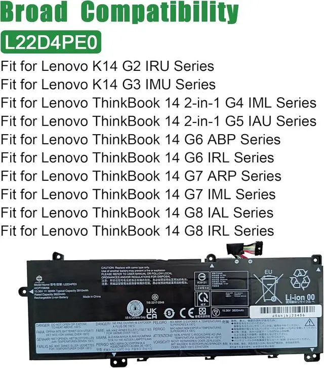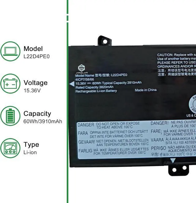 Model: L22D4PE0 // Voltage: 15.36V // Capacity: 60Wh 3910mAh // Color: Black // Type: Plug & Play Li-ion Battery.