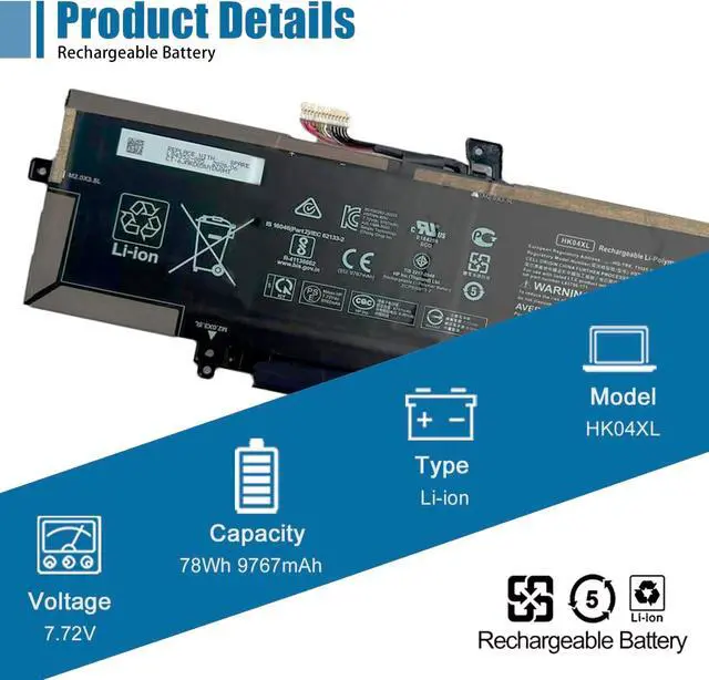 SpecificationsModel: HK04XL. Type: Li-ion. Voltage: 7.72V. Capacity: 78.5Wh 9767mAh. Up to 1000 recharge cycles over the life of the battery.