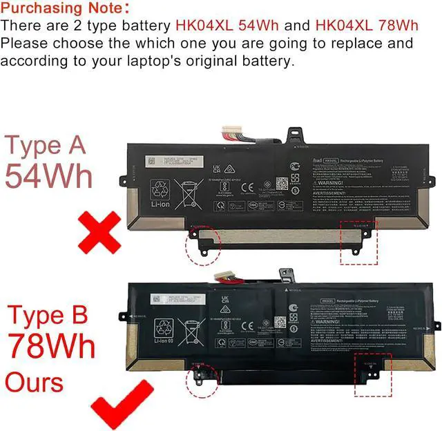 Replace Part NumberHK04XL L84352-005 L82391-005 HSTNN-IB9H HSTNN-IB9J L83796-171 HKO4XL 2ICP6/69/75-2. (Please note that there are 2 types of HK04XL battery, which the shape and screw hole are different so they can not be replaced for each other,please open the back cover of your laptop to compare the shape and screw hole with my photo before order.)