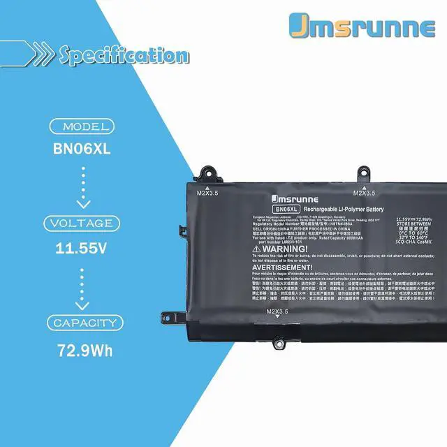 HP BN06XL Specifications Model: BN06XL rechargeable battery / Voltage: 11.55V / Capacity:72.9Wh /Battery type: Li-ion. /Battery life: Up to 1000 recharge cycles over the life of the battery. Also comes with installation tools.Purchasing Note: Due to the complexity of laptop battery models, you may not be able to accurately determine the model you need to purchase,Please open the back cover of the laptop to confirm the original battery model number