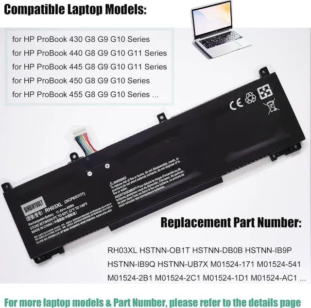 Fit for LaptopRH03XL Battery Fit for HP ProBook 430 G8 Series, HP ProBook 440 G8 Series, HP ProBook 445 G8 Series, HP ProBook 450 G8 Series, HP ProBook 455 G8 Series and so on. Please refer to the details page.