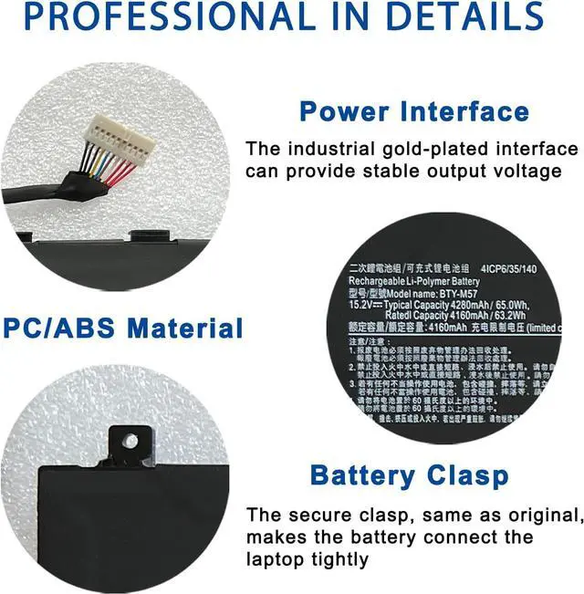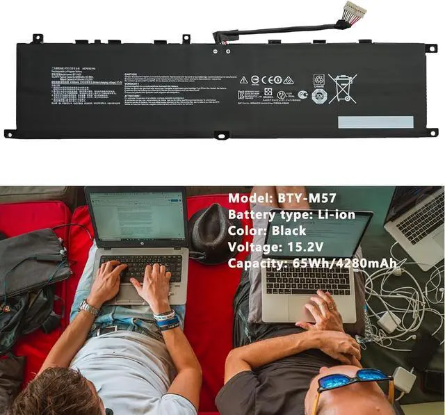SpecificationsModel:BTY-M57// Battery type: Li-ion // Voltage:15.2V // Capacity: 65Wh/4280mAh// 100% New from Manufacturer. Top circuit boards and smart chip.