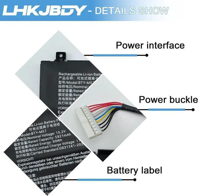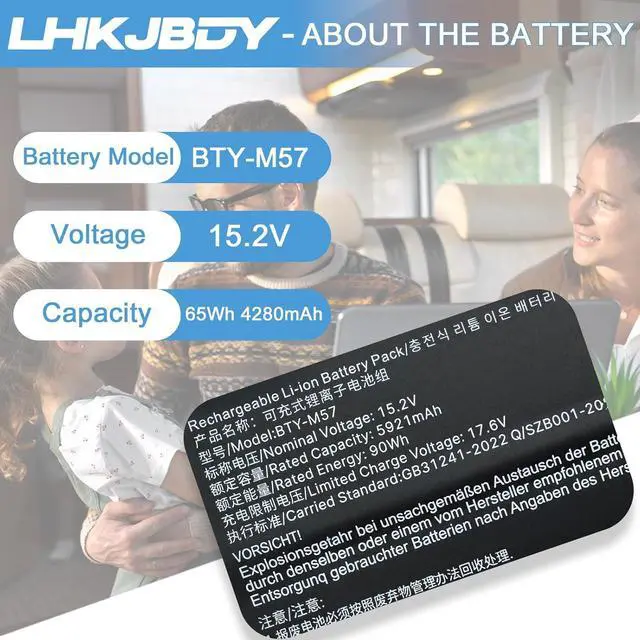 Specifications: Type: BTY-M57; Voltage: 15.2V; Capacity: 4280mAh/65Wh; Color: Black. Battery type: Lithium-Ion; The Packages includes: 1pcs BTY-M57 Laptop Battery Replacement, 2pcs Screwdrivers, 1 pcs Instruction for BTY-M57 Battery. The batteries are certified by UL and CE, ensuring safety and high performance