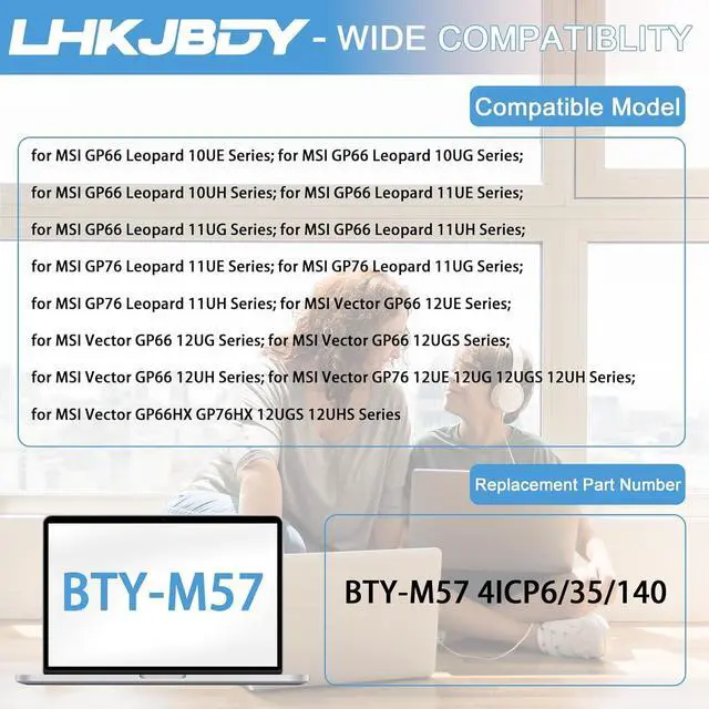 Compatible Laptop Models: BTY-M57 battery for MSI GP66 Leopard 10UE Series; for MSI GP66 Leopard 10UG Series; for MSI GP66 Leopard 10UH Series; for MSI GP66 Leopard 11UE Series; for MSI GP66 Leopard 11UG Series; for MSI GP66 Leopard 11UH Series; for MSI GP76 Leopard 11UE Series; for MSI GP76 Leopard 11UG Series; for MSI GP76 Leopard 11UH Series; for MSI Vector GP66 12UE Series; for MSI Vector GP66 12UG Series; for MSI Vector GP66 12UGS Series; for MSI Vector GP66 12UH Series; for MSI Vector GP76 12UE 12UG 12UGS 12UH Series; for MSI Vector GP66HX GP76HX 12UGS 12UHS Series