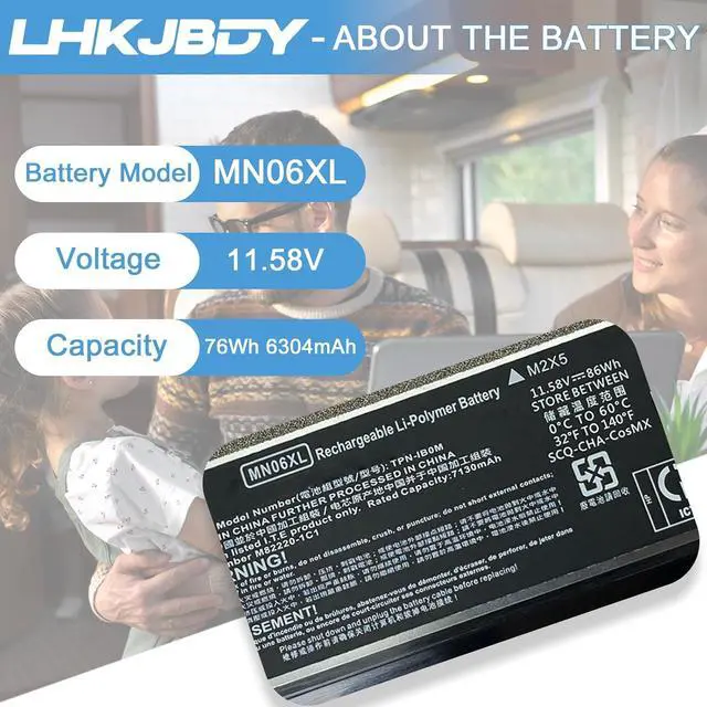 Specifications: Type: MN06XL; Voltage: 11.58V; Capacity: 6304mAh/76Wh; Color: Black. Battery type: Lithium-Ion; The Packages includes: 1pcs MN06XL Laptop Battery Replacement, 2pcs Screwdrivers, 1 pcs Instruction for MN06XL Battery. The batteries are certified by UL and CE, ensuring safety and high performance