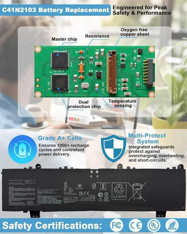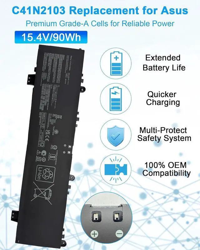 Specifications: Model Name: C41N2103 standard Rechargeable Li-ion Battery; Battery Type: Lithium_ion; Voltage: 15.4 V; Capacity: 90Wh 5845mAh. Color: Black. Packages includes:1x C41N2103 Laptop Battery, 2 x Screwdrivers for easy installation, 1x Instruction