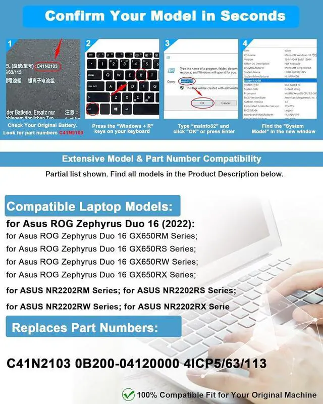 Compatible Laptop Models: Replacement for for Asus NR2202RM Series; Fit for Asus NR2202RS Series; Fit for Asus NR2202RW Series; Fit for Asus NR2202RX Series; fit for Asus ROG Zephyrus Duo 16 GX650RM Series; fit for Asus ROG Zephyrus Duo 16 GX650RS Series; for Asus ROG Zephyrus Duo 16 GX650RW Series; fit for Asus ROG Zephyrus Duo 16 GX650RX Series
