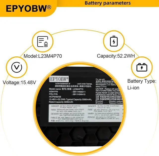 Specifications Battery Model: L23M4P70 / Voltage: 15.48V / Capacity: 52.5Wh 3392mAh 4-Cell / Color: Black / Condition: Brand New.