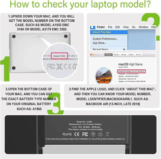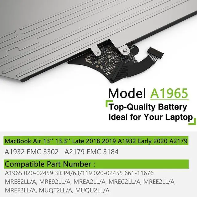Compatible with Laptop ModelsFit for MacBook Air 13 inch 13.3 inch Late 2018 2019 A1932(EMC 3184), Early 2020 A2179(EMC 3302) A1965 Laptop Battery. Model Identifier: MacBookAir8,1 & MacBookAir8,2 & MacBookAir9,1.