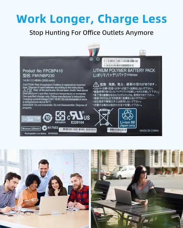SPECIFICATION : Model Name: FPCBP410 Voltage: 14.8V; Capacity:48WH/3300mAh.; Grade A cells ensure fast charges and low power consumption; Built-in circuit protection ensures both safety and stability. Condition: 100% New; Battery life: More than 1000 cycles.