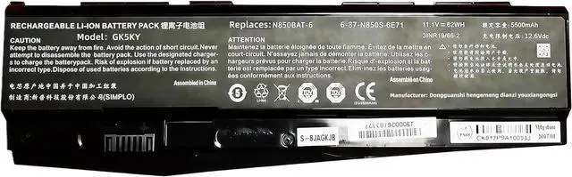 SPECIFICATION : Model Name: N850BAT-6 Voltage: 11.1V Capacity: 62Wh/5500mAh; Grade A cells ensure fast charges and low power consumption; Built-in circuit protection ensures both safety and stability. Condition: 100% New; Battery life: More than 1000 cycles.