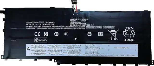 SPECIFICATION : Model Name: 00HW028 Voltage: 15.2V; Capacity: 52Wh/50Wh. Cells: 3-Cells.; Grade A cells ensure fast charges and low power consumption; Built-in circuit protection ensures both safety and stability. Condition: 100% New; Battery life: More than 1000 cycles.