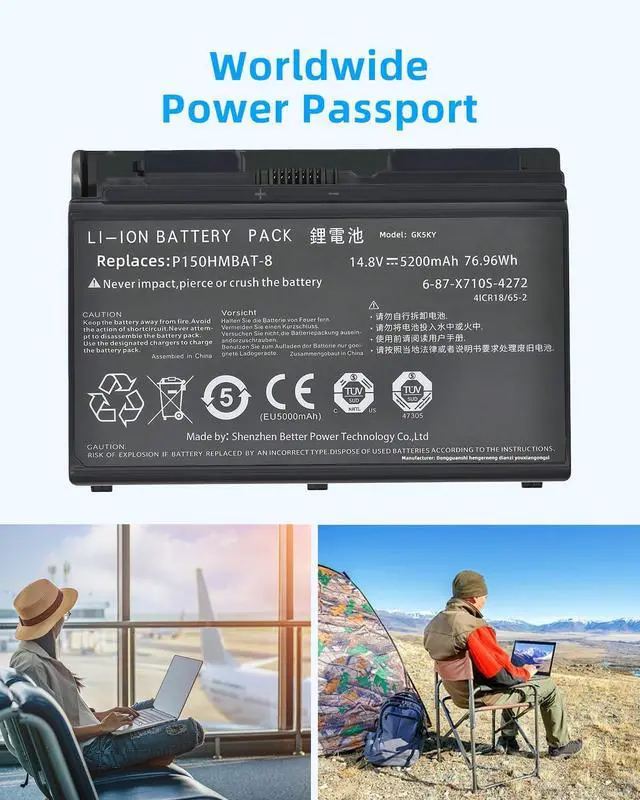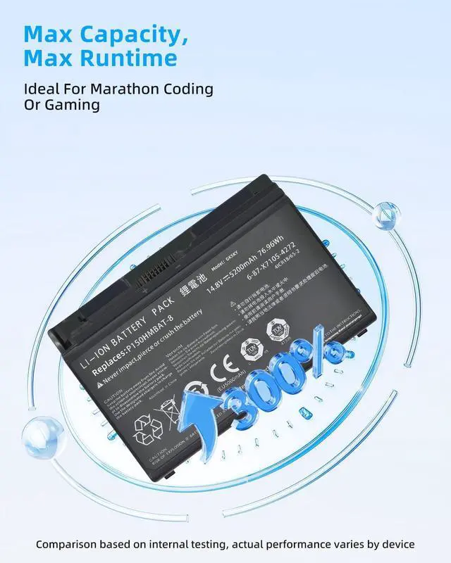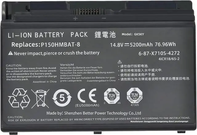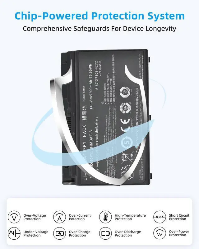 SPECIFICATION : Model Name:P150HMBAT-8(X710S) Voltage: 14.8V; Capacity: 5200mAh/76.96Wh; Cells: 8-cell Grade A cells ensure fast charges and low power consumption; Built-in circuit protection ensures both safety and stability. Condition: 100% New; Battery life: More than 1000 cycles.