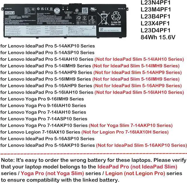Compatible with Machine Modelsfor Lenovo Yoga Pro 7-14AKP10 (Type: 83KG) Series; for Lenovo Legion 7-16IAX10 (Type: 83KY) Series;for Lenovo IdeaPad Pro 5-16ASP10 (Type: 83LS) Series;for Lenovo IdeaPad Pro 5-16AKP10 (Type: 83JN) Series. (NOTE: It's easy to order the wrong battery for these laptops. Please verify that your laptop model belongs to the IdeaPad Pro (not IdeaPad Slim) series / Yoga Pro (not Yoga Slim) series / Legion (not Legion Pro) series to ensure compatibility with the linked battery.)