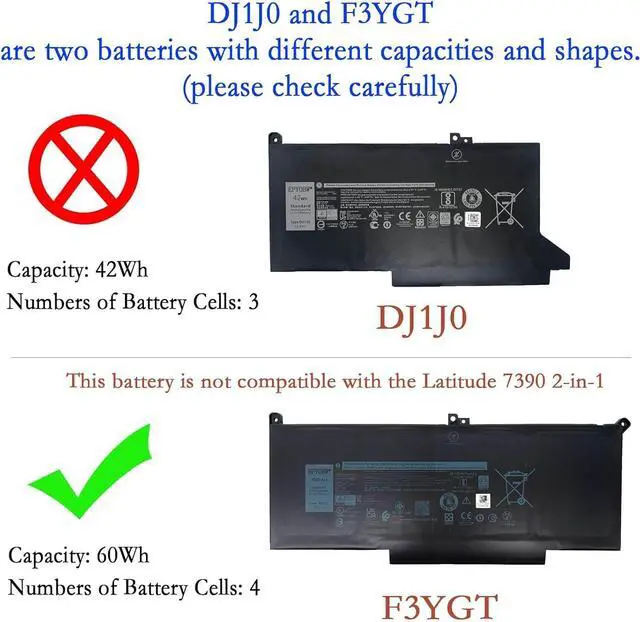 (Note: There are two batteries with different capacities and shapes, the DJ1J0 42 Wh and the F3YGT 60 Wh. Before placing an order, it is strongly recommended that you check the casing and capacity of the old battery. Please open the back cover of the laptop to confirm your battery type before purchasing.)