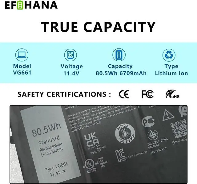 SpecificationsModel:VG661// Battery type: Li-ion // Voltage:11.4V// Capacity:80.5Wh 6709mAh// 100% New from Manufacturer. Top circuit boards and smart chip.