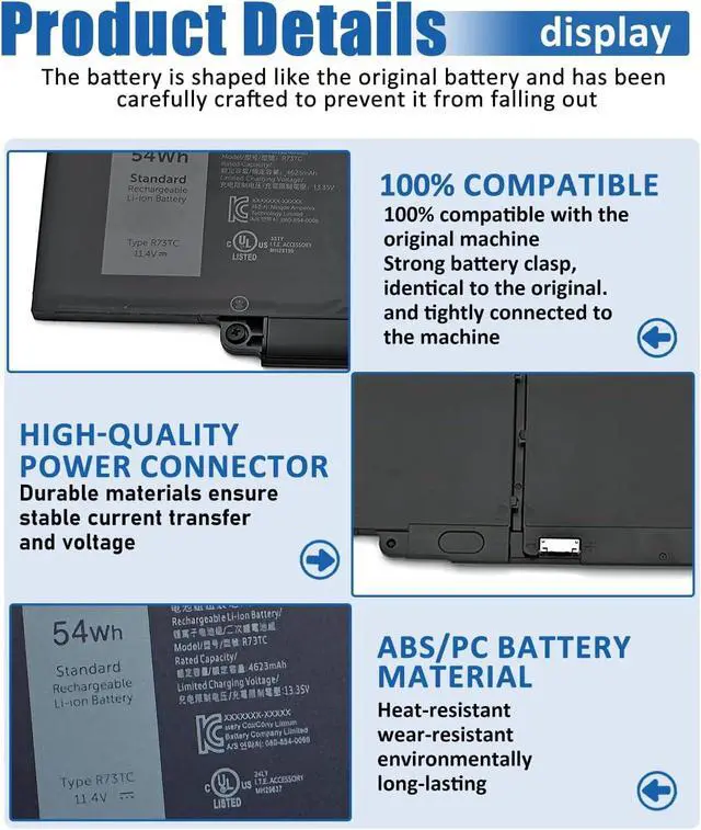 Battery SpecificationsModel Name: R73TC Battery, Battery Type:Lithium_ion Voltage: 11.4V; Capacity:54Wh / 4623mAh ; Color: Black. More than 500 cycles, Packages includes: 1x R73TC Battery ,1 Set x Screwdrivers,1x Instruction for R73TC Laptop Battery