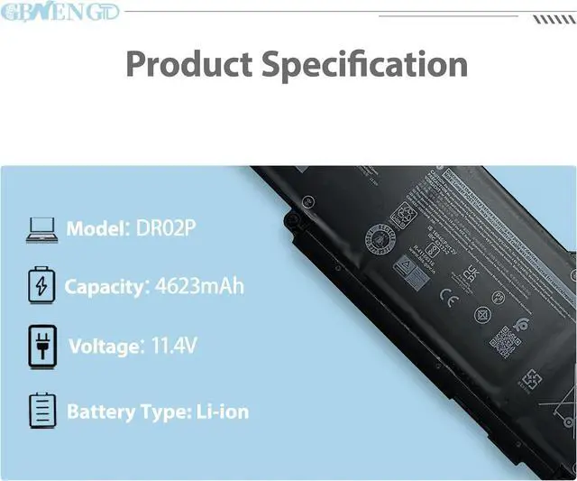 Specifications Model: DR02P Capatity: 54Wh Voltage:11.4V Color: Black Battery type: Rechargeable Li-ion Battery Condition: 100% brand New from Manufacturer.
