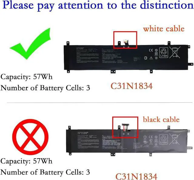 Compatible with Laptop Models for Asus ProArt StudioBook 17 H700GV W700G2T W700G2T-AV004R Series; for Asus ProArt StudioBook Pro 17 H700GV-AV047R W700G1T-AV009T W700G1T-AV012R W700G1T-AV015R W700G1T-AV022T W700G1T-AV023R W700G1T-AV046R W700G1T-AV050R W700G1T-AV056R W700G1T-AV059R W700G1T-HK9711W W700G2T-AV002R W700G2T-AV004R W700G2T-AV011T W700G2T-AV014R W700G2T-AV020R W700G2T-AV060R W700G2T-AV065R W700G2T-AV069R W700G2T-AV070R W700G2T-2G W700G2T-AV014R Series.(Note: C31N1834 57Wh has two different color cables, black and white. Please open the back cover of the laptop to confirm the battery type before purchasing.)