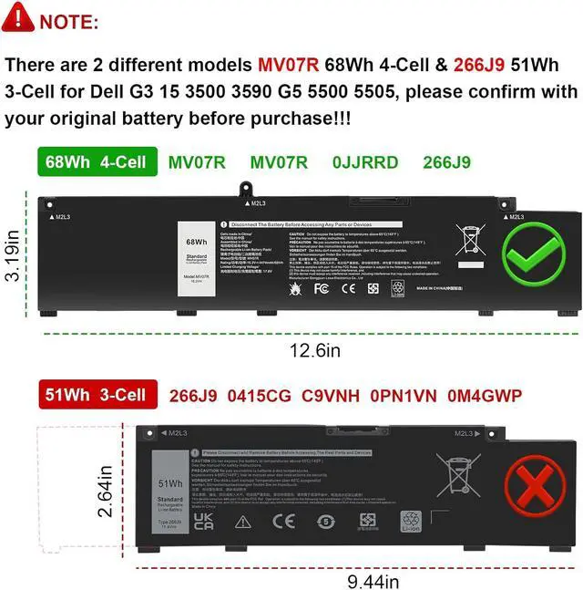 Note: There are 2 different batteries: 68Wh MV07R and 51Wh 266J9. This listing we sell is MV07R, 266J9 is shorter than MV07R. Please confirm your original battery type before placing the order