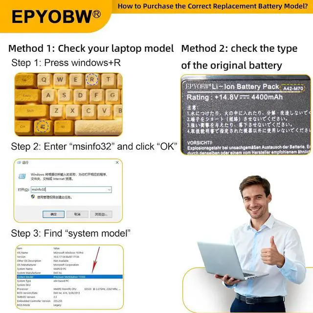 Purchase Skills Please open the back cover of the laptop before ordering and make sure that the original battery model is consistent with the listing. After getting the battery, please install the battery correctly, make sure that the battery connector is firmly connected to the laptop motherboard, and use the original charger to charge the laptop.Discharge the new battery to 5% (not 0%), then charge and cycle 3-4 times to wake up the new battery.