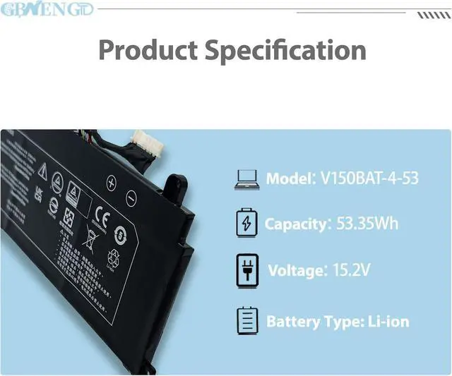 Specifications Model: V150BAT-4-53 Capatity: 53.35Wh Voltage:15.2V Color: Black Battery type: Rechargeable Li-ion Battery Condition: 100% brand New from Manufacturer.